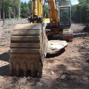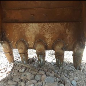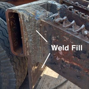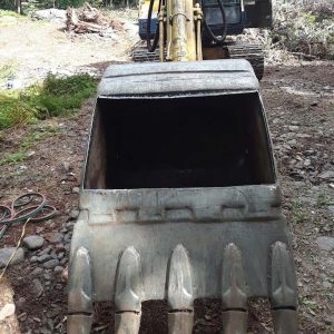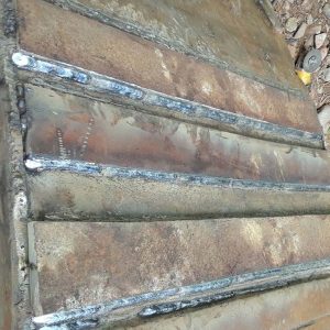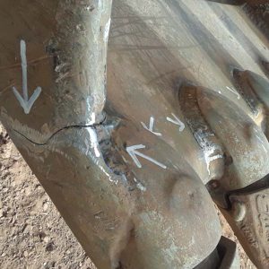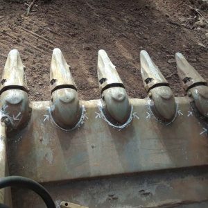 BACKHOE BUCKET REPAIR This backhoe bucket was in very bad shape. I had to cut it out and replace it with a 3/4 inch plate. I also welded in ribs for extra strength. All the marked areas were welded (and there were many) One of the digging toes was nearly broken off. Job was completed and the backhoe is back in service