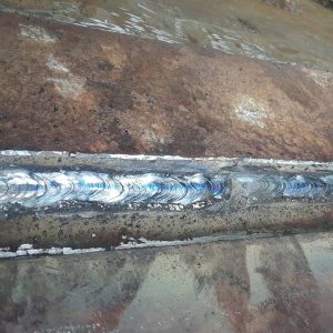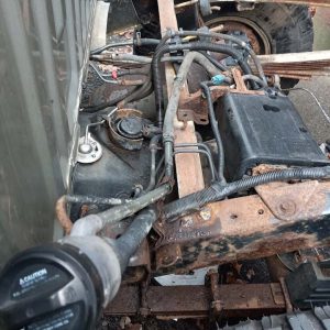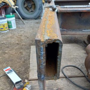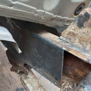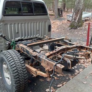 TRUCK CHASSIS WELD I had to take the bed and muffler off the truck to get to the rusted area of the frame. I also removed the rotten crossmember which held the gas tank up, the muffler, gas lines and filters. After cutting all the rust out I welded 3 plates on the frame to strengthen the frame and pass inspection.